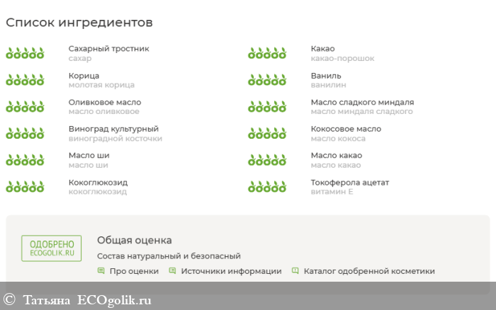 сахар, какао-порошок, молотая корица, ванилин, масло оливковое, масло миндаля сладкого, виноградной косточки, масло кокоса, масло ши, масло какао, кокоглюкозид, витамин Е.