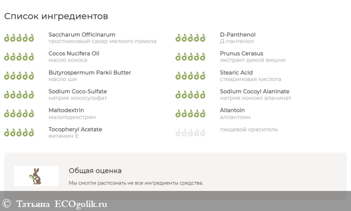 тростниковый сахар мелкого помола, Д-пантенол, масло кокоса (рафинированное), экстракт дикой вишни, масло ши, стеариновая кислота, натрия кокосульфат (кокосульфат натрия), натрия кокоил аланинат, мальтодекстрин, молочная кислота 80%, аллантоин, витамин Е, пищевой краситель, натуральная ароматическая композиция с гипоаллергенным статусом.