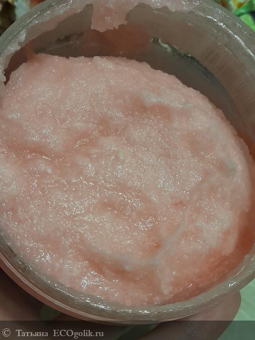 Цвет скраба нежно-розовый, сливочно-ягодный.