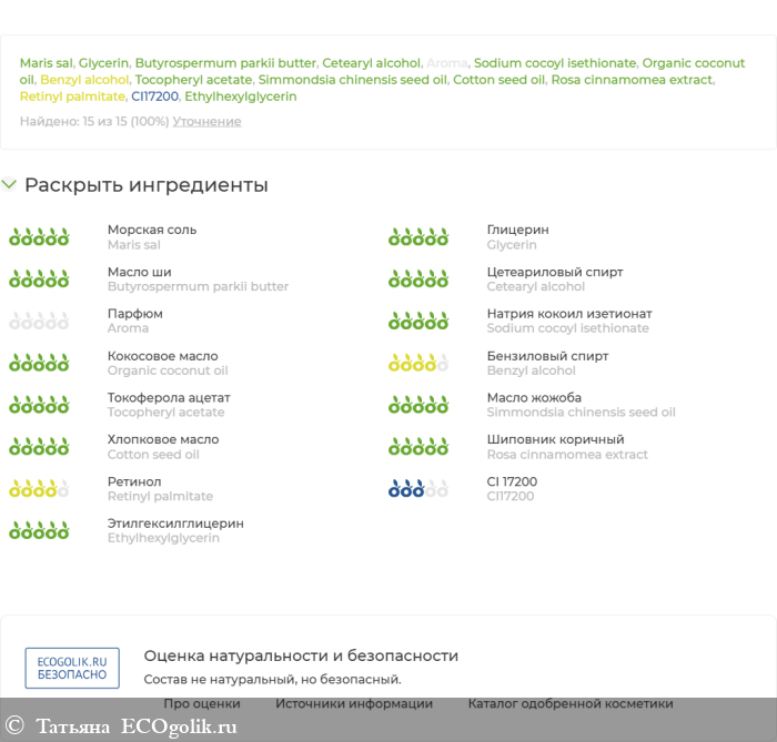 Maris sal (морская соль), Glycerin (глицерин), Butyrospermum parkii (Shea) butter (масло ши), Cetearyl alcohol (цетилстеариловый спирт), Aroma (отдушка), Sodium cocoyl isethionate (изетионат натрия), Organic coconut oil (масло кокоса органик), Benzyl alcohol (бензиловый спирт), Tocopheryl acetate (витамин Е), Simmondsia chinensis (Jojoba) seed oil (масло жожоба), Cotton seed oil (масло хлопковое), Rosa cinnamomea extract (экстракт шиповника), Retinyl palmitate (витамин А), CI17200, Ethylhexylglycerin (этилгексилглицерин)