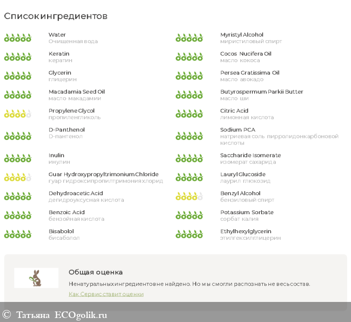 Очищенная вода, миристиловый спирт, кератин, масло кокоса, глицерин, масло авокадо, масло макадамии, масло ши, пропиленгликоль, лимонная кислота, D-пантенол, натриевая соль пирролидонкарбоновой кислоты, инулин, изомерат сахарида, гуар гидроксипропилтримония хлорид, лаурил глюкозид, дегидроуксусная кислота, бензиловый спирт, бензойная кислота, сорбат калия, бисаболол, этилгексилглицерин, натуральная парфюмерная композиция с гипоаллергенным статусом.