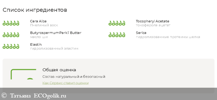 Пчелиный воск, токоферола ацетат, масло ши, гидролизованные протеины шелка, гидролизованный эластин