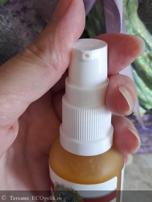 Сыворотка имеет однородную гелиевую текстуру. Она красивого желтого цвета, достаточно густая, капелька не растекается. Аромат приятный, натуральный, травяной.