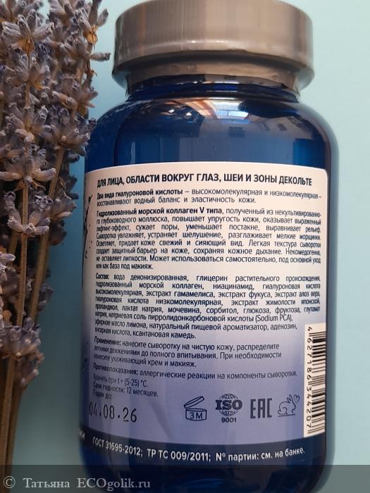 Два вида гиалуроновой кислоты – высокомолекулярная и низкомолекулярная - восстанавливают водный баланс и эластичность кожи. Гидролизованный морской коллаген V типа, полученный из некультивированного глубоководного моллюска, повышает упругость кожи, оказывает выраженный лифтинг-эффект, сужает поры, уменьшает постакне, выравнивает рельеф. Сыворотка увлажняет, устраняет шелушение, разглаживает мелкие морщинки. Осветляет, придает коже свежий и сияющий вид. Легкая текстура сыворотки создает защитный барьер на коже, сохраняя кожное дыхание. Некомедогенна, не оставляет липкости. Может использоваться самостоятельно, под основной уход или как база под макияж. Подходит для всех типов кожи.
