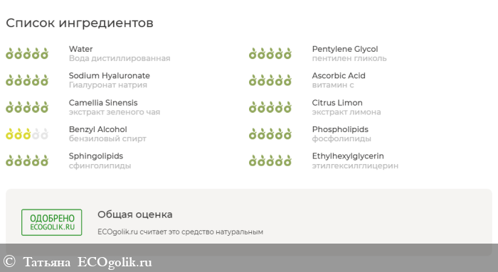 Вода дистиллированная; пентилен гликоль; Гиалуронат натрия; витамин с; экстракт зеленого чая; экстракт лимона; бензиловый спирт; фосфолипиды; сфинголипиды; этилгексилглицерин