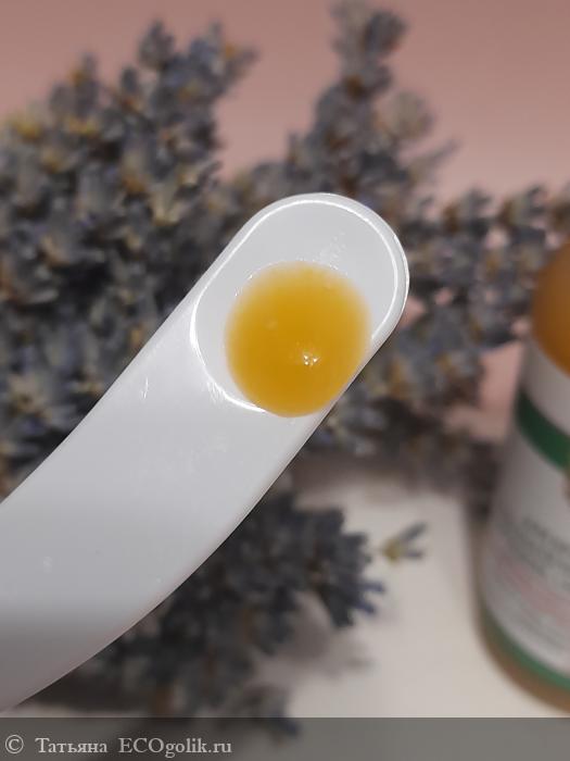 Сыворотка имеет очень удачную консистенцию, она средней густоты, с легкостью распределяется по коже. Мне нравится ее красивый золотистый цвет и приятный растительно-цветочный аромат. Текстура легкая и невесомая, на коже я ее совсем не ощущаю.