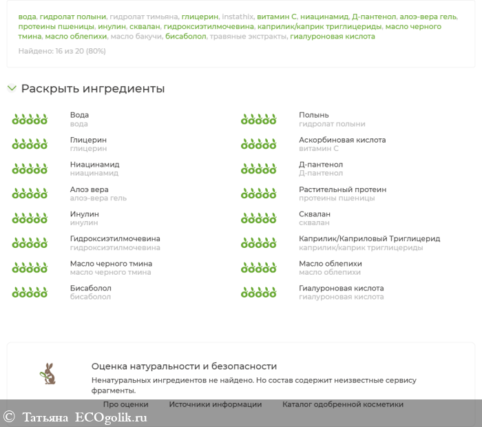вода, гидролат полыни, гидролат тимьяна, глицерин, instathix, витамин С, ниацинамид, Д-пантенол, алоэ-вера гель, протеины пшеницы, инулин, сквалан, гидроксиэтилмочевина, каприлик/каприк триглицериды, масло черного тмина, масло облепихи, масло бакучи, бисаболол, травяные экстракты, гиалуроновая кислота