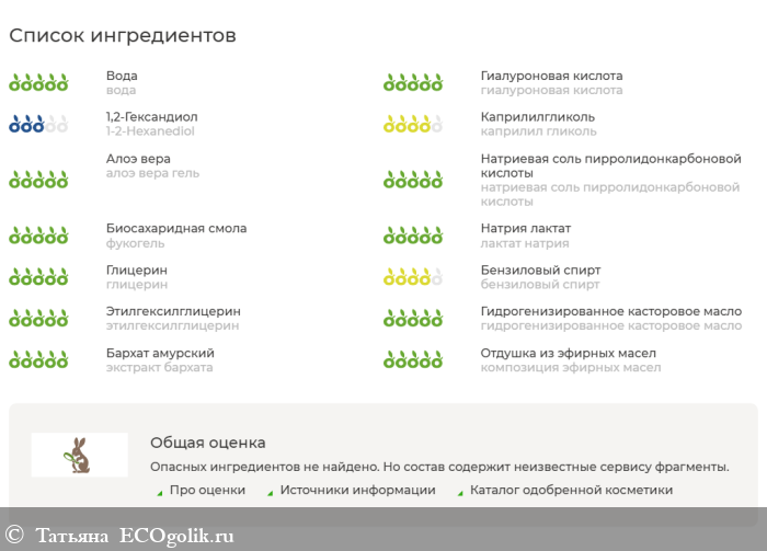вода, гиалуроновая кислота, 1,2-гександиол, каприлил гликоль, алоэ вера гель, натриевая соль пирролидонкарбоновой кислоты, пентиленкликоль, фукогель, лактат натрия, глицерин, бензиловый спирт, этилгексилглицерин, гидрогенизированное касторовое масло, экстракт бархата, композиция эфирных масел.