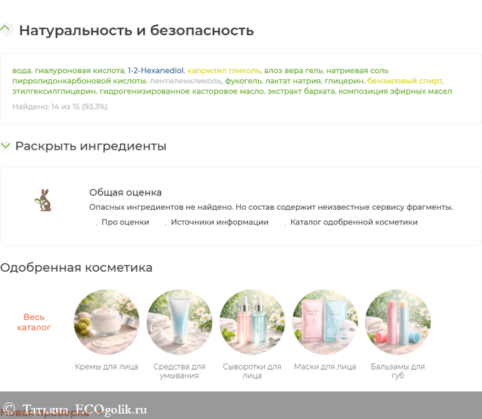 вода, гиалуроновая кислота, 1,2-гександиол, каприлил гликоль, алоэ вера гель, натриевая соль пирролидонкарбоновой кислоты, пентиленкликоль, фукогель, лактат натрия, глицерин, бензиловый спирт, этилгексилглицерин, гидрогенизированное касторовое масло, экстракт бархата, композиция эфирных масел.