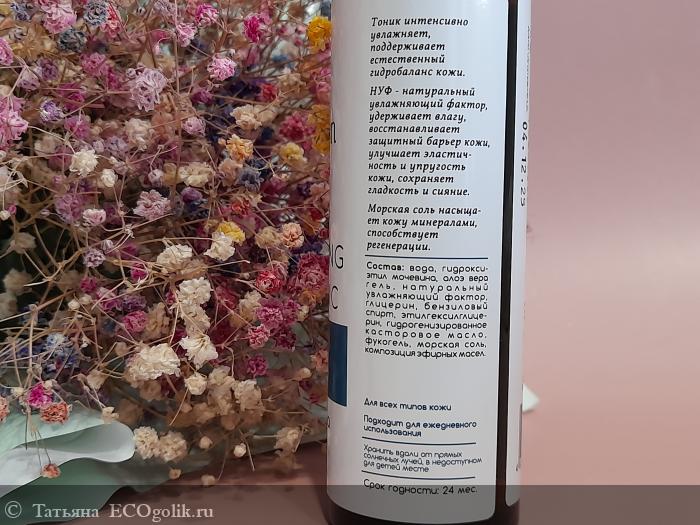 Тоник интенсивно увлажняет, поддерживает естественный гидробаланс кожи. НУФ - натуральный увлажняющий фактор, удерживает влагу, восстанавливает защитный барьер кожи, улучшает эластичность и упругость кожи, сохраняет гладкость и сияние. Морская соль насыщает кожу минералами, способствует регенерации.