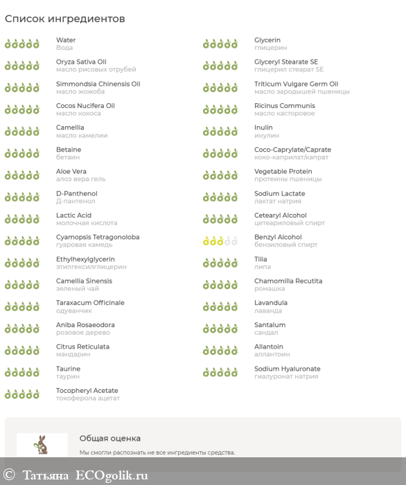 Вода, гидролат лаванды, глицерин, масло рисовых отрубей, глицерил стеарат SE, масло жожоба, масло зародышей пшеницы, масло кокоса, масло касторовое, масло камелии, инулин, бетаин, коко-каприлат/капрат, алоэ вера гель, протеины пшеницы, Д-пантенол, лактат натрия, молочная кислота, цетеариловый спирт, гуаровая камедь, бензиловый спирт, этилгексилглицерин, экстракты: липа, зеленый чай, ромашка, мелиса, одуванчик; эфирные масла: лаванда, розовое дерево, сандал, мандарин; аллантоин, таурин, гиалуронат натрия, токоферола ацетат (Витамин Е).