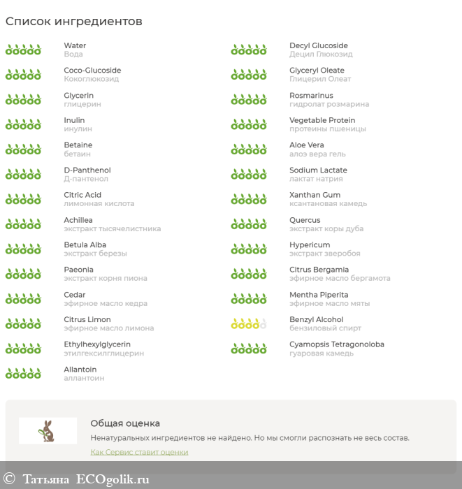 Вода, органическая моющая основа (Натрия Лаурил Глюкозид Карбоксилат (и) Лаурил Глюкозид, Децил Глюкозид, Кокоглюкозид, Глицерил Олеат), глицерин, гидролат розмарина, инулин, протеины пшеницы, бетаин, алоэ вера гель, Д-пантенол, лактат натрия, лимонная кислота, ксантановая камедь, экстракты: тысячелистник, кора дуба, береза, зверобой, корень пиона; эфирные масла: бергамот, кедр, мята, лимон; бензиловый спирт, этилгексилглицерин, гуаровая камедь, аллантоин, сорбат калия.