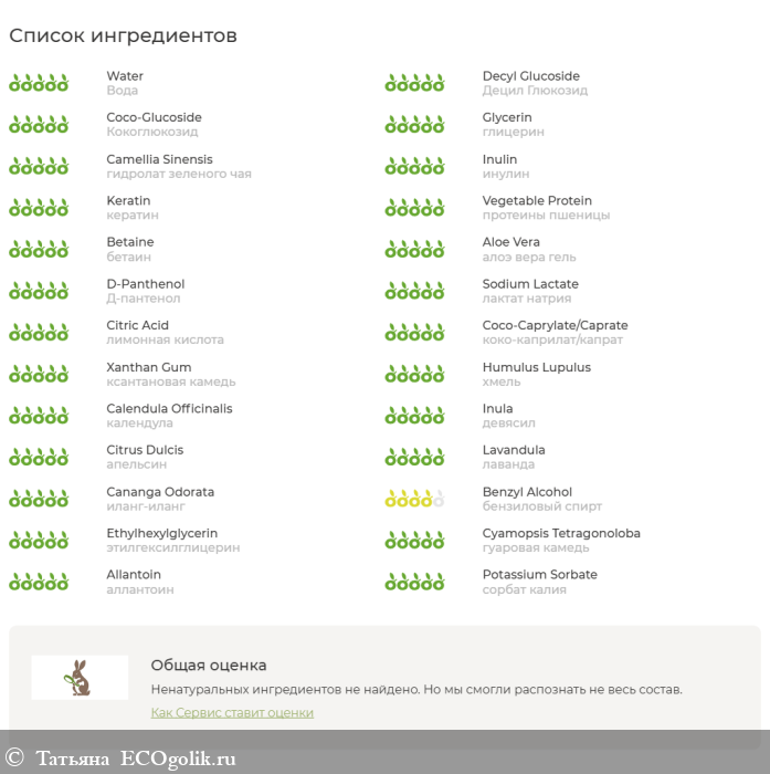 Вода, органическая моющая основа (Натрия Лаурил Глюкозид Карбоксилат (и) Лаурил Глюкозид, Децил Глюкозид, Кокоглюкозид, Глицерил Олеат), глицерин, гидролат зеленого чая, инулин, кератин, протеины пшеницы, бетаин, алоэ вера гель, Д-пантенол, лактат натрия, лимонная кислота, коко-каприлат/капрат, ксантановая камедь, экстракты: хвощ, хмель, календула, василек, девясил; эфирные масла: апельсин, лаванда, иланг-иланг; бензиловый спирт, этилгексилглицерин, гуаровая камедь, аллантоин, сорбат калия