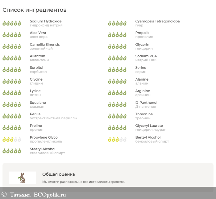 Ионизированная вода, гидроксид натрия, гуар, алоэ вера, гель листьев алоэ, прополис, зеленый чай, глицерин, аллантоин, натрий ПКК, сорбитол, серин, глицин, аланин, лизин, аргинин, сквалан, Д-пантенол, экстракт гриба мешима лекарственного, экстракт листьев периллы, экстракт корней байкальского шлемника, экстракт из корня корейского красного женьшеня, экстракт корня пуэрарии лобата дольчатой, экстракт трав Схизонепета, треонин, пролин, парфюм, глицерил лаурат, пропиленгликоль, бензиловый спирт, стеариловый спирт.