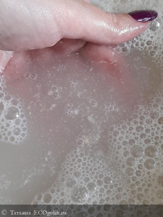 Одного пакета хватает на три применения, так как для разового использования достаточно 100 г средства. Просто насыпаю нужное количество в ванную с водой комфортной температуры. Вода меняет свой цвет, на поверхности появляется шипящая нежная пенка.