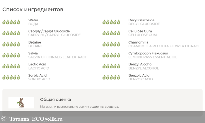ВОДА, ДЕЦИЛ ГЛЮКОЗИД, КАПРИЛИЛ/КАПРИЛ ГЛЮКОЗИД, КАРБОКСИМЕТИЛЦЕЛЛЮЛОЗА, БЕТАИН, ЭКСТРАКТ ЦВЕТКОВ РОМАШКИ АПТЕЧНОЙ, ЭКСТРАКТ ЛИСТЬЕВ ШАЛФЕЯ ЛЕКАРСТВЕННОГО, ЭФИРНОЕ МАСЛО ЛЕМОНГРАССА, МОЛОЧНАЯ КИСЛОТА, БЕНЗИЛОВЫЙ СПИРТ, СОРБИНОВАЯ КИСЛОТА, БЕНЗОЙНАЯ КИСЛОТА AQUA, DECYL GLUCOSIDE, CAPRYLYL/ CAPRYL GLUCOSIDE, CELLULOSE GUM, BETAINE, CHAMOMILLA RECUTITA FLOWER EXTRACT, SALVIA OFFICINALIS LEAF EXTRACT, LEMONGRASS ESSENTIAL OIL, LACTIC ACID, BENZYL ALCOHOL, SORBIC ACID, BENZOIC ACID