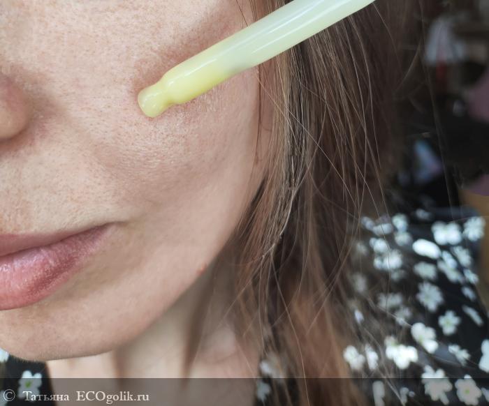 Капаю немного сыворотки на кожу и далее пальчиком распределяю. Наносится легко, не растекается.
