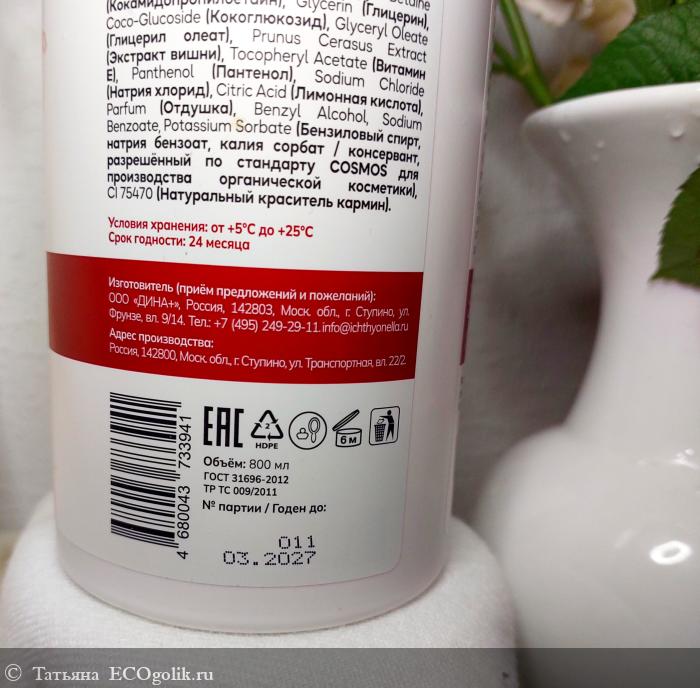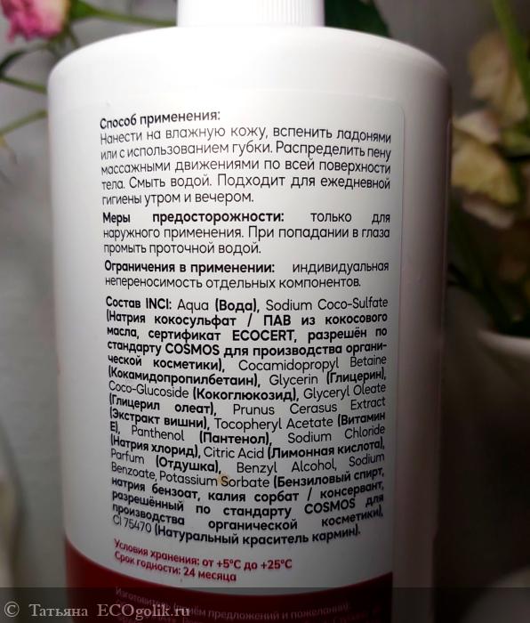 Состав: Aqua (Вода), Sodium Coco-Sulfate (Натрия кокосульфат / ПАВ из кокосового масла, сертификат ECOCERT, разрешён по стандарту COSMOS для производства органической косметики), Cocamidopropyl Betaine (Кокамидопропилбетаин), Glycerin (Глицерин), Coco-Glucoside (Кокоглюкозид), Glyceryl Oleate (Глицерил олеат), Prunus Cerasus Extract (Экстракт вишни), Tocopheryl Acetate (Витамин Е), Panthenol (Пантенол), Sodium Chloride (Натрия хлорид), Citric Acid (Лимонная кислота), Parfum (Отдушка), Benzyl Alcohol, Sodium Benzoate, Potassium Sorbate (Бензиловый спирт, натрия бензоат, калия сорбат / консервант, разрешённый по стандарту COSMOS для производства органической косметики), CI 75470 (Натуральный краситель кармин).