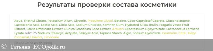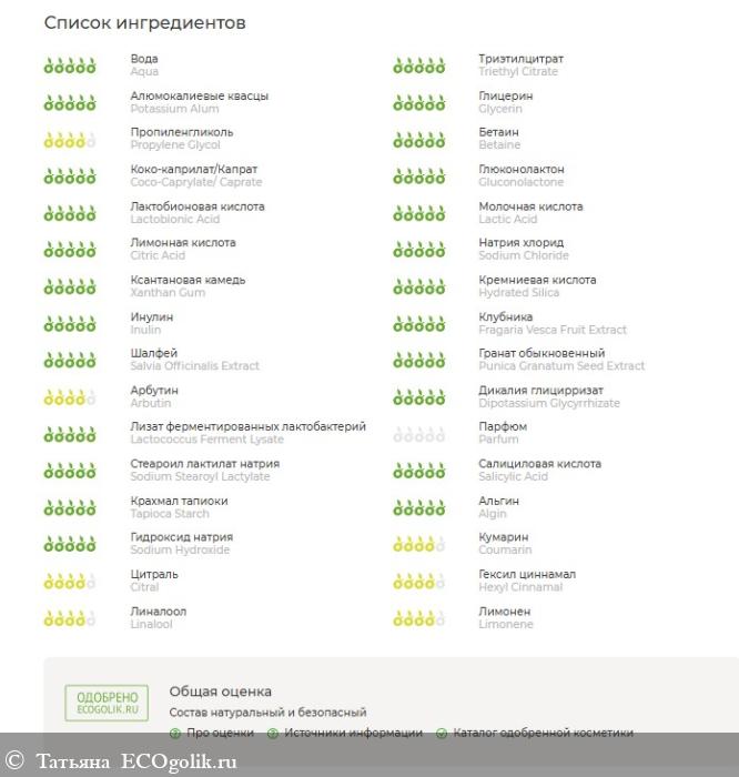 Состав/INCI:Aqua (вода), Triethyl Citrate (триэтилцитрат), Potassium Alum (алюмокалиевые квасцы), Glycerin (глицерин), Propylene Glycol (plant-based) (растительный пропиленгликоль), Betaine (бетаин), Coco-Caprylate/ Caprate (натуральный эмолент), Gluconolactone (глюконолактон), Lactobionic Acid (лактобионовая кислота), Lactic Acid (молочная кислота), Citric Acid (лимонная кислота), Sodium Chloride (хлорид натрия), Xanthan Gum (ксантановая камедь), Hydrated Silica (гидратированный диоксид кремния), Inulin (инулин), Fragaria Vesca Fruit Extract (экстракт плодов клубники), Salvia Officinalis Extract (экстракт шалфея лекарственного), Punica Granatum Seed Extract (экстракт семян граната), Arbutin (арбутин), Dipotassium Glycyrrhizate (дикалия глицирризинат), Lactococcus Ferment Lysate (лизат ферментов лактококков), Parfum (парфюмерная композиция), Sodium Stearoyl Lactylate (растительный эмульгатор), Salicylic Acid (салициловая кислота), Tapioca Starch (загуститель), Algin (загуститель), Sodium Hydroxide (регулятор кислотности), Coumarin, Citral, Hexyl Cinnamal, Linalool, Limonene (ароматические компоненты)