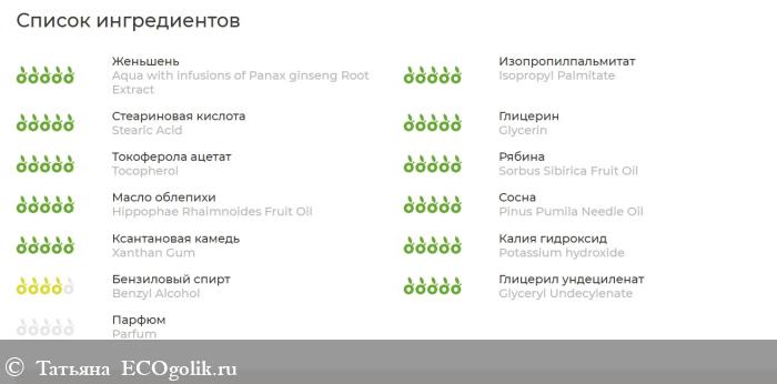 Aqua with infusions of Panax ginseng Root Extract* (экстракт женьшеня); Isopropyl Palmitate, Stearic Acid, Сetyl Palmitate, Glycerin, Rosa Сanina Fruit Oil* (масло шиповника), Tocopherol, Sorbus Sibirica Fruit Oil (масло ягод рябины сибирской), Hippophae Rhaimnoides Fruit Oil* (масло алтайской облепихи), Pinus Pumila Needle Oil (масло кедрового стланника), Xanthan Gum, Potassium hydroxide, Benzyl Alcohol, Glyceryl Undecylenate, Parfum. * - органические ингредиенты.