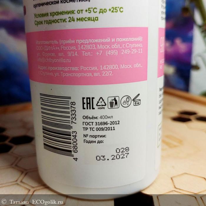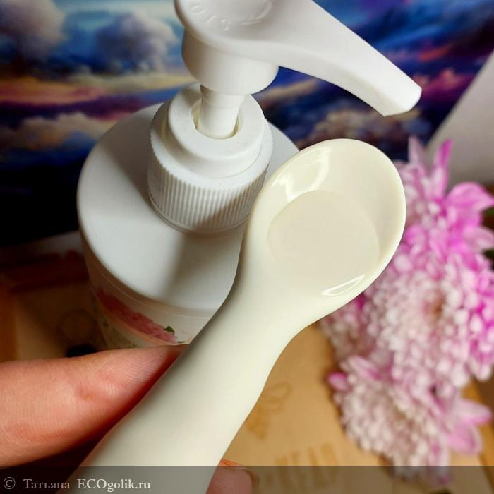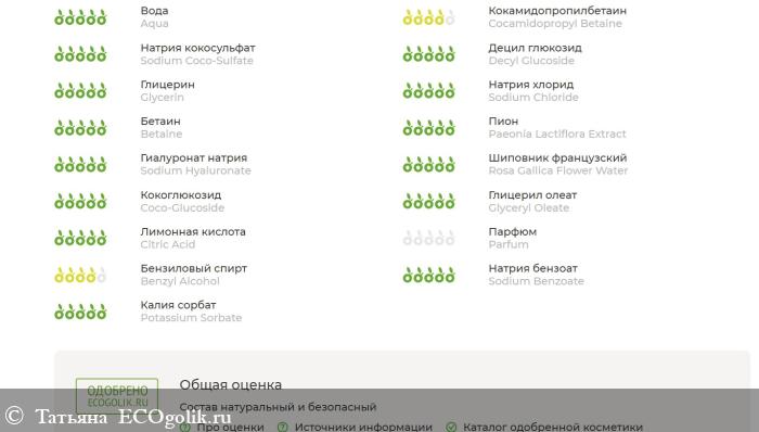 Состав (INCI): Aqua (Вода), Cocamidopropyl Betaine (Кокамидопропилбетаин), Sodium Coco-Sulfate (Натрия кокосульфат / ПАВ из кокосового масла, сертификат ECOCERT, разрешён по стандарту COSMOS для производства органической косметики), Decyl Glucoside (Алкилполигликозид),Glycerin (Глицерин), Sodium Chloride (Натрия хлорид), Betaine (Бетаин), Paeonia Lactiflora Extract (Экстракт пиона), Sodium Hyaluronate (Гиалуронат натрия), Rosa Gallica Flower Water (Розовая вода), Coco-Glucoside (Кокоглюкозид), Glyceryl Oleate (Глицерил олеат), Citric Acid (Лимонная кислота), Parfum (Отдушка), Benzyl Alcohol, Sodium Benzoate, Potassium Sorbate (Бензиловый спирт, натрия бензоат, калия сорбат / консервант, разрешённый по стандарту COSMOS для производства органической косметики)