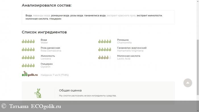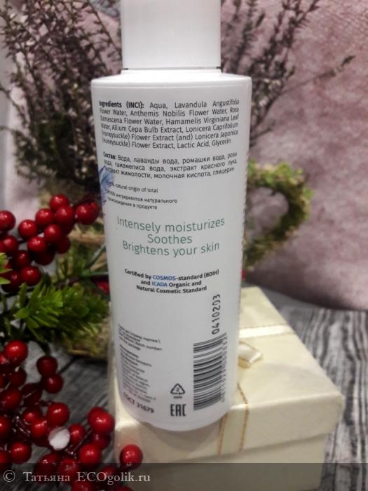 Вода, лаванды вода, ромашки вода, розы вода, гамамелиса вода, экстракт красного лука, экстракт жимолости, молочная кислота, глицерин.