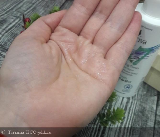 Он прозрачного цвета, при откручивания дозатора видно, что жидкость цвета не имеет. На ладонь оказалось прозрачной.