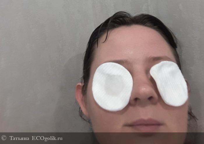 Чтобы увлажниить диск я делаю около 4-5 пшиков. Потому протираю глаз одной стороной ватного диска, переворачиваю и протираю второй. На лицо использую другой.