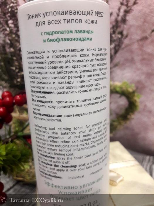 - Тоник - заканчивает очищение, и является усилителем эффекта от кремов. Тоник №56 - идеален на макияж и для освежения, Тоник №58 - вместо термальной воды, от обезоживания .. Тоник №59 - антиоксидантый. И №57 идеален для проблемной кожи с акне, и после акне, с воспалениями.