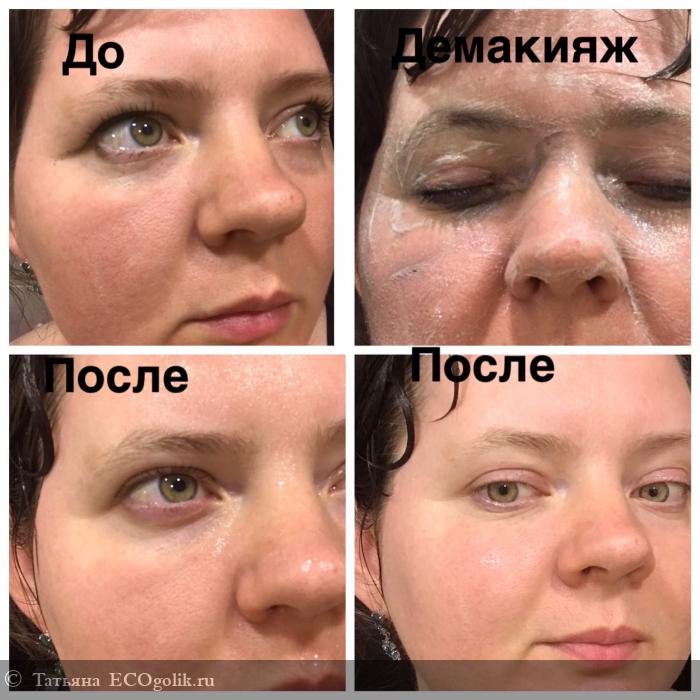 Макияж он убирает с первого раза, растворяет тушь до самого конца. Но чтобы все прошло успешно, нужно обязательно массировать не менее 40 секунд, но не более 1 минуты.