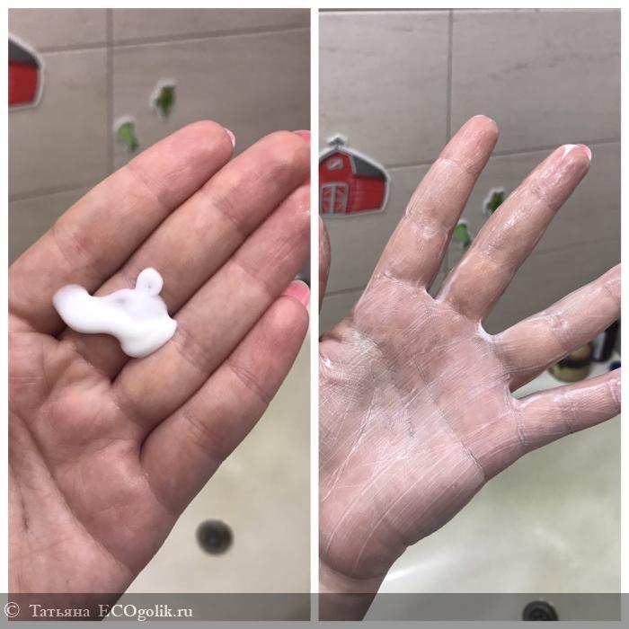 Консистенция у него кремовая. Очень нежная, как густое молочко питательное. По тактильным ощущениям явно чувствую крем! Отлично распределяется и смывается быстро.