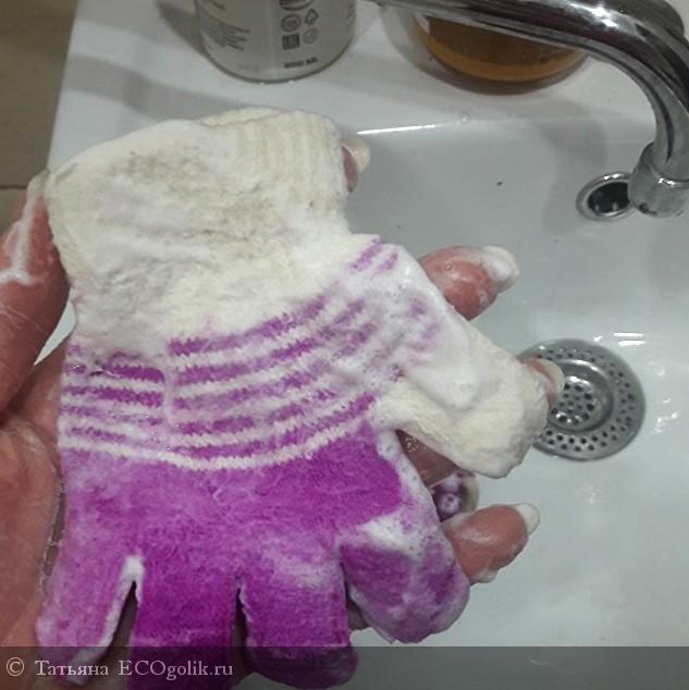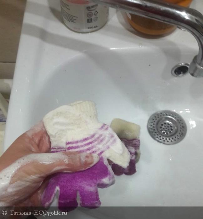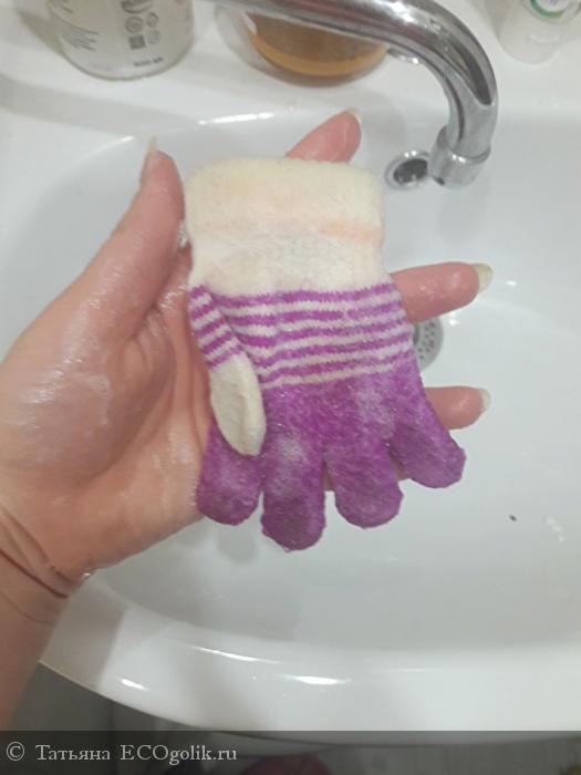 При намыливании мыло плохо пенилось, но тут же начала стекать грязь. Я сполоснула и при повторной стирки, уже образовалась легкая пена. Мыло прекрасно намылилось, и стирка не заняла больше минуты. Перчатки были чистые и белоснежные, без потери свойств шерсти!