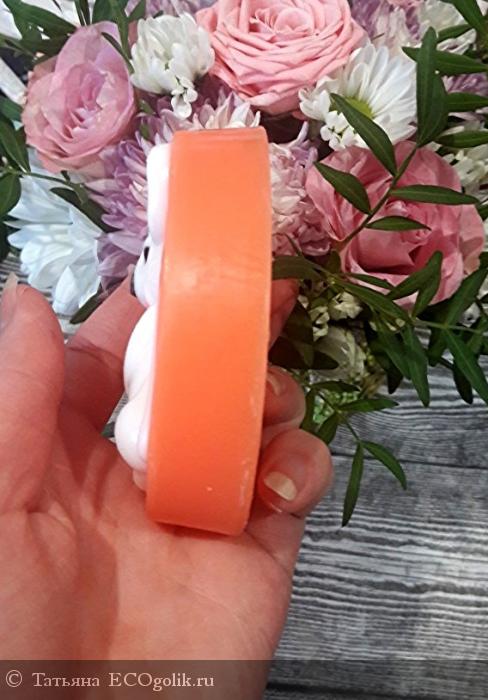 2. Для душа - мыло хорошо очищает кожу, достаточно провести один раз по участку тела и намылить, или на мылить губку. Пенится мыло очень умерено, но моет прекрасно). душе царит очень вкусный аромат похожий на мандариново-апельсиновый аромат.