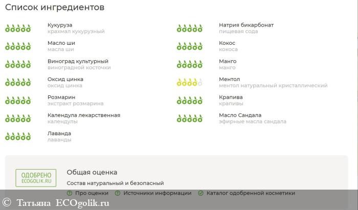 крахмал кукурузный, пищевая сода, масла ши, кокоса, виноградной косточки, манго, оксид цинка, ментол натуральный кристаллический, CO2- экстракты розмарина, крапивы, календулы, эфирные масла сандала и лаванды.