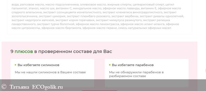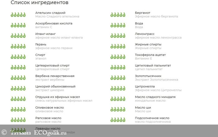 Состав: вода, рапсовое масло**, масло подсолнечника**, оливковое масло**, жирные спирты, цетеариловый спирт, цетил пальмитат, этанол (Demeter)**, масло ши*, витамин С, миндальное масло**, эфирное масло лаванды**, витамин Е, эфирное масло сладкого апельсина**, экстракт солнцецвета монетолистного**, экстракт клематиса виноградолистного**, экстракт золототысячника**, экстракт цикория, экстракт плюмбаго розового**, экстракт вербены**, экстракт дивалы однолетней, экстракт недотроги капской**, экстракт корня горечавки, экстракт мимулуса разинутого, экстракт репешка лекарственного, экстракт турчи болотной, эфирное масло лемонграсса*, эфирное масло иланг-иланга*, эфирное масло цитронеллы*, эфирное масло бергамота*, эфирное масло герани **, смесь натуральных эфирных масел (линалоол, лимонен, цитраль, цитронеллол, гераниол).