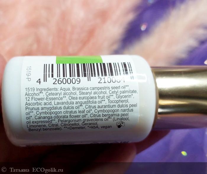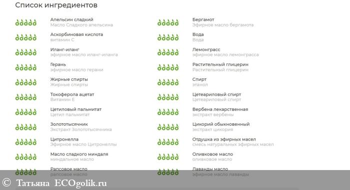 вода, рапсовое масло**, этанол (Demeter )**, цетеариловый спирт, жирные спирты, цетил пальмитат, экстракт солнцецвета монетолистного**, экстракт клематиса виноградолистного**, экстракт золототысячника**, экстракт цикория, экстракт плюмбаго розового **, экстракт вербены**, экстракт дивалы однолетней, экстракт недотроги капской**, экстракт корня горечавки, экстракт мимулуса разинутого, экстракт репешка лекарственного, экстракт турчи болотной, оливковое масло**, растительный глицерин*, витамин С, эфирное масло лаванды**, витамин Е, миндальное масло**, эфирное масло сладкого апельсина **, эфирное масло лемонграсса*, эфирное масло цитронеллы*, эфирное масло иланг-иланга*, эфирное масло бергамота**, эфирное масло герани**, смесь натуральных эфирных масел (линалоол, лимонен, цитраль, цитронеллол, гераниол, бензилбензоат)