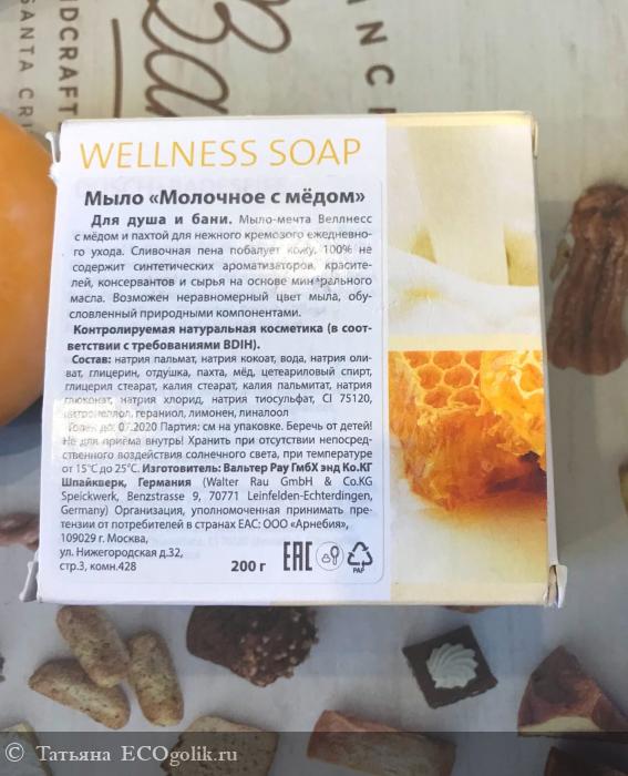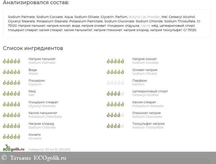 Sodium Palmate, Sodium Cocoate, Aqua, Sodium Olivate, Glycerin, Parfum, Butyris Lac Powder, Mel, Cetearyl Alcohol, Glyceryl Stearate, Potassium Stearate, Potassium Palmitate, Sodium Gluconate, Sodium Chloride, Sodium Thiosulfate, CI 75120. Натрия пальмат, натрия кокоат, вода, натрия оливат, глицерин, отдушка, пахта, мёд, цетеариловый спирт, глицерил стеарат, калия стеарат, калия пальмитат, натрия глюконат, натрия хлорид, натрия тиосульфат, CI 75120..