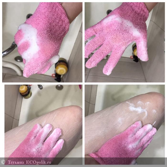 Но мне больше нравится использовать перчатку для пилинга. Она создает эффект отшелушивания. На ней мыло пенится обильно, и достаточно одного намыливание чтобы принять душ.