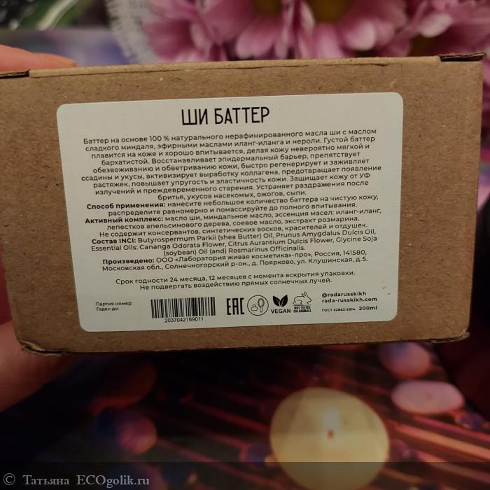Всем добрый день. Благодаря Экоголику и RADA RUSSKIKH в самое интересное положение в жизни женщины, я попробовала очень нужное и эффективное средство - баттер ШИ. Масло ши славиться своими заслугами как на коже детей, так и у взрослых, а полностью натуральное и обогащенное дополнительными натуральными экстрактами и маслами, вообще на все золота.