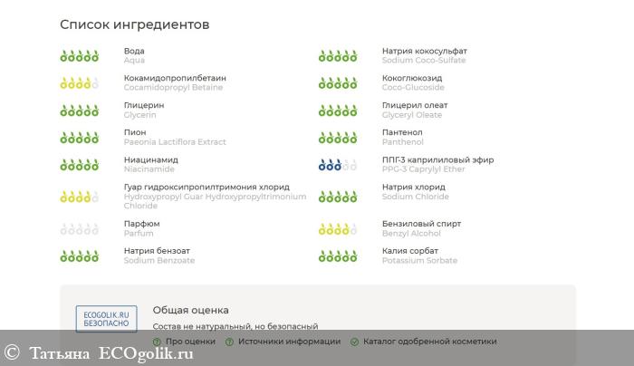 Состав INCI: Aqua (Вода), Sodium Coco-Sulfate (Натрия кокосульфат / ПАВ из кокосового масла, сертификат ECOCERT, разрешён по стандарту COSMOS для производства органической косметики), Cocamidopropyl Betaine (Кокамидопропилбетаин), Coco-Glucoside (Кокоглюкозид), Glycerin (Глицерин), Glyceryl Oleate (Глицерил олеат), Paeonia Lactiflora Extract (Экстракт пиона), Panthenol (Пантенол), Niacinamide (Ниацинамид), PPG-3 Caprylyl Ether («Растительный силикон» / натуральный кондиционирующий агент из жирных масел), Hydroxypropyl Guar Hydroxypropyltrimonium Chloride (Катионное производное гуаровой камеди), Sodium Chloride (Натрия хлорид), Parfum (Отдушка), Benzyl Alcohol, Sodium Benzoate, Potassium Sorbate (Бензиловый спирт, натрия бензоат, калия сорбат / консервант, разрешённый по стандарту COSMOS для производства органической косметики).