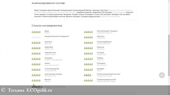 Вода, Глицерин растительный, Натуральный Увлажняющий Фактор (Бетаин, Натрия РСА, Натрия лактат, Пирролидон карбоксилат, Серин, Аланин, Глицин, Глютаминовая кислота, Лизин (гидрохлорид), Треонин, Аргинин, Пролин), Сенсива (Фенилэтиловый спирт, Этилгексилглицерин), N-ацетил-D-глюкозамин, Софольянс (Пробиотик: Фермент Гриба Бомбикола/Глюкоза/Метил фермента рапса), Ратании CО2 экстракт, Арабиногалактан (пребиотик), Зверобоя СО2 экстракт, СО2 экстракты: Куркума, Тмин черный, Солодка уральская, Гвоздика, Тимьян, Хмель, Розмарин, Уснеи CО2 экстракт, Шалфея CO2 экстракт, Ксантан, Полиглутаминовая кислота, Ванили экстракт, Супероксиддисмутаза, Тремелы полисахарид.