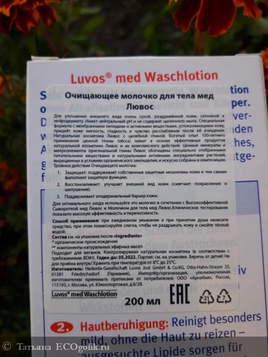 Объём тюбика очищающего молочка для тела Мед Лювос 200 мл., производство Германия, стоимость на официальном сайте 1734 рубля, на Эковиль можно найти за 1367 рублей.