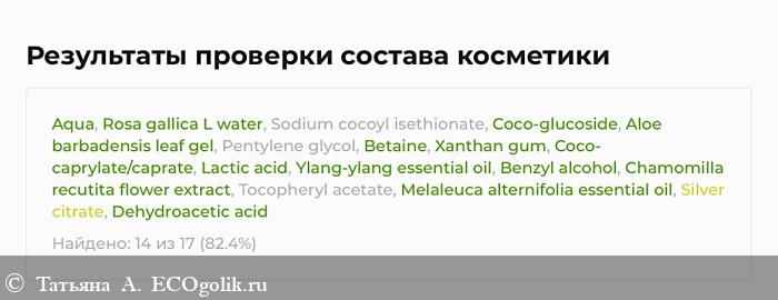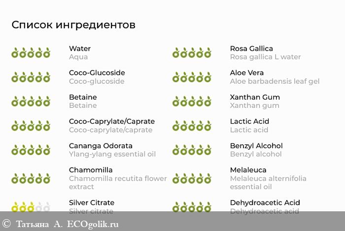 СОСТАВ: Aqua (вода дистиллированная), Rosa gallica L. water (гидролат розы), Sodium сocoyl isethionate (натрия кокоил изетионат), Coco-glucoside (кокоглюкозид), Aloe barbadensis (aloe vera) leaf gel (гель алоэ вера), Рentylene glycol* (пентилен гликоль), Betaine (бетаин), Xanthan gum (ксантановая камедь), Coco-caprylate/caprate (коко-каприлат/капрат), Lactic acid (молочная кислота), Ylang-ylang essential oil (эфирное масло иланг-иланг), Benzyl alcohol (бензиловый спирт), Chamomilla recutita (matricaria) flower extract (экстракт ромашки), Tocopheryl аcetate (витамин Е), Melaleuca alternifolia (tea tree) essential oil (эфирное масло чайного дерева), Silver citrate (цитрат серебра), Dehydroacetic аcid (дегидроуксусная кислота). *изготовлен из багассы, получаемой из сахарного тростника.