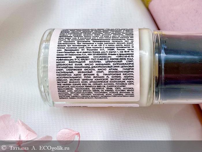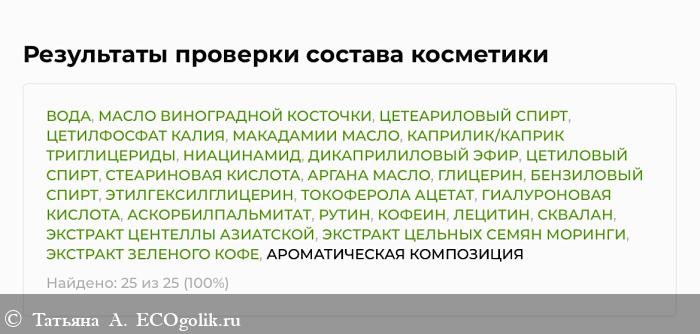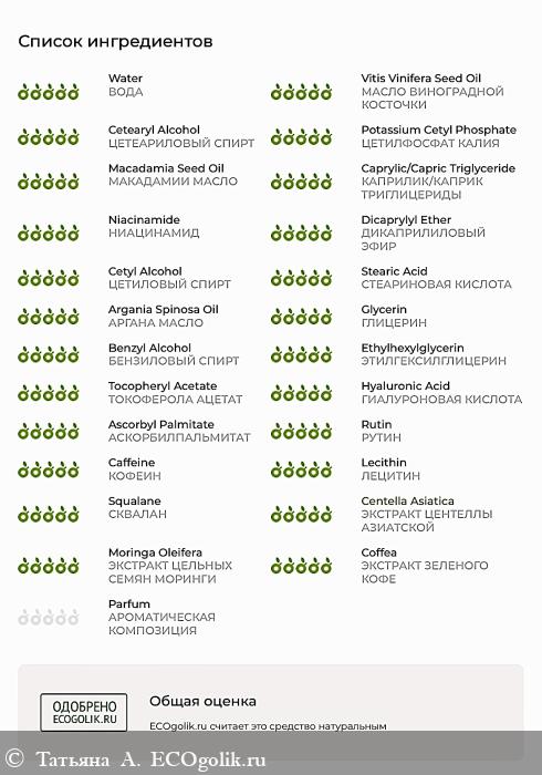 СОСТАВ: ВОДА, МАСЛО ВИНОГРАДНОЙ КОСТОЧКИ, ЦЕТЕАРИЛОВЫЙ СПИРТ, ЦЕТИЛФОСФАТ КАЛИЯ, МАКАДАМИИ МАСЛО, КАПРИЛИК/КАПРИК ТРИГЛИЦЕРИДЫ, НИАЦИНАМИД, ДИКАПРИЛИЛОВЫЙ ЭФИР, ЦЕТИЛОВЫЙ СПИРТ, СТЕАРИНОВАЯ КИСЛОТА, АРГАНА МАСЛО, ГЛИЦЕРИН, БЕНЗИЛОВЫЙ СПИРТ, ЭТИЛГЕКСИЛГЛИЦЕРИН, ТОКОФЕРОЛА АЦЕТАТ (ВИТАМИН Е), ГИАЛУРОНОВАЯ КИСЛОТА, АСКОРБИЛПАЛЬМИТАТ, РУТИН (ВИТАМИН Р), КОФЕИН, ЛЕЦИТИН, СКВАЛАН, ЭКСТРАКТ ЦЕНТЕЛЛЫ АЗИАТСКОЙ, ЭКСТРАКТ ЦЕЛЬНЫХ СЕМЯН МОРИНГИ, ЭКСТРАКТ ЗЕЛЕНОГО КОФЕ, АРОМАТИЧЕСКАЯ КОМПОЗИЦИЯ.