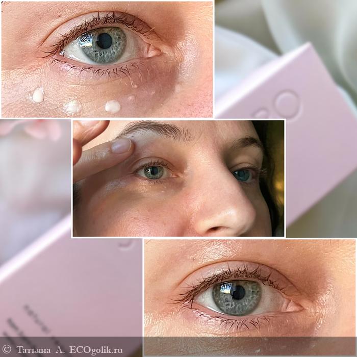 Крем наношу на очищенную кожу лёгкими движениями по области орбитальной косточки. Достаточно 2-3 капелек, чтобы получился тонкий слой, который впитывается практически сразу, принося с собой приятную прохладу и увлажнённость.