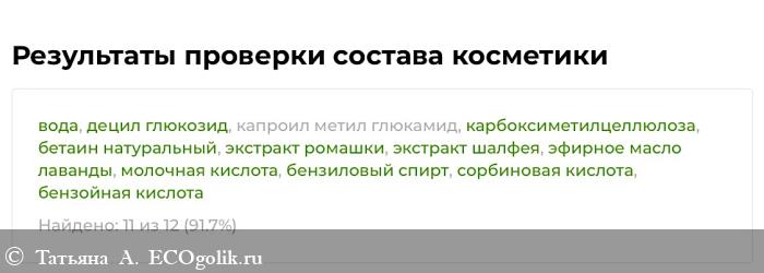 Сервис проверки Экоголик не смог распознать один компонент — капроил метил глюкамид, но на этикетке производитель указал, что это мягкий, зелёный, биоразлагаемый ПАВ, поэтому состав