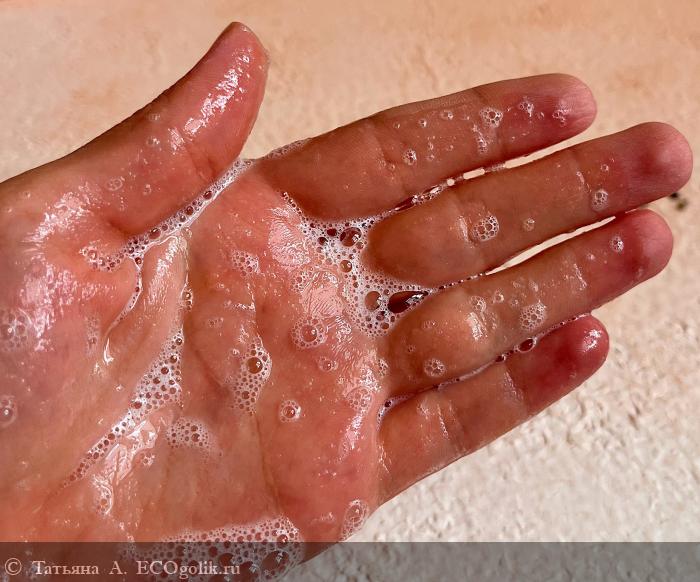 Пенка у жидкого мыла получается ожидаемо не пышная из-за натурального состава, но очень нежная. Ручкам очень нравится!