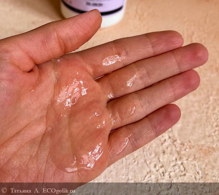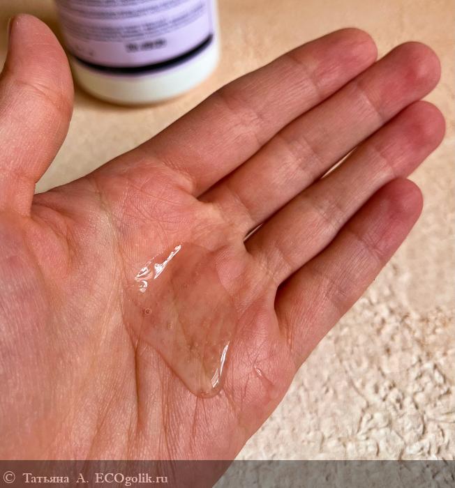 Мыло имеет гелевую текстуру, которая медленно стекает по руке. Мне нравится такая степень густоты жидкого мыла, она обеспечивает экономичный расход. На однократное очищение средства нужно совсем чуть-чуть: 1-2 нажатия на дозатор. Дозатор работает очень плавно и позволяет легко регулировать размер порции.