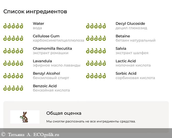 СОСТАВ: вода, децил глюкозид, капроил метил глюкамид, карбоксиметилцеллюлоза, бетаин натуральный, экстракт ромашки, экстракт шалфея, эфирное масло лаванды, молочная кислота, бензиловый спирт, сорбиновая кислота, бензойная кислота.