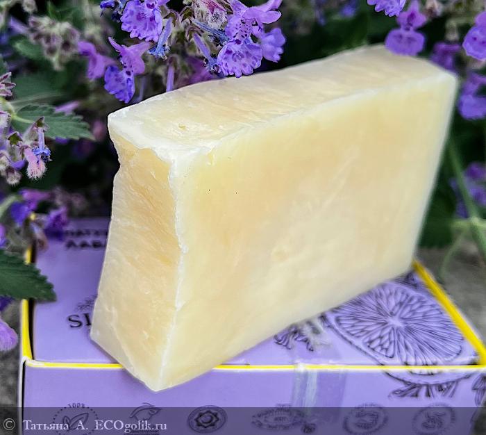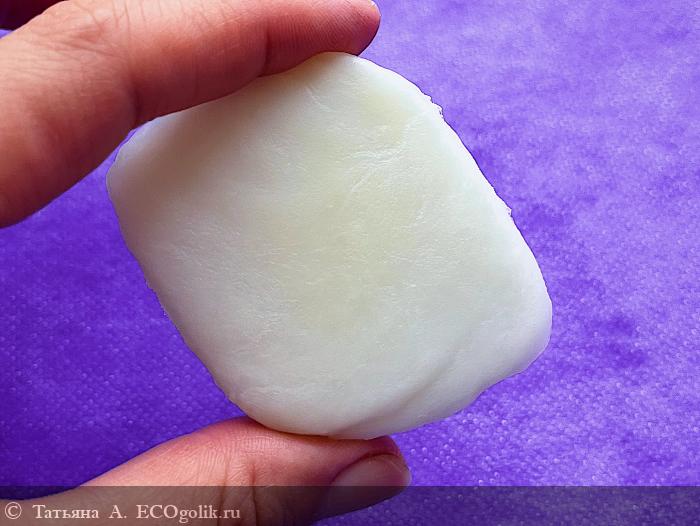 Брусочек прямоугольной формы нежного кремово-жёлтого цвета. Его очень украшает фирменный оттиск с названием бренда. Такого в моей коллекции ещё не было.